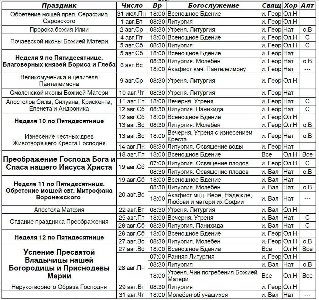Расписание богослужений на август 2017
