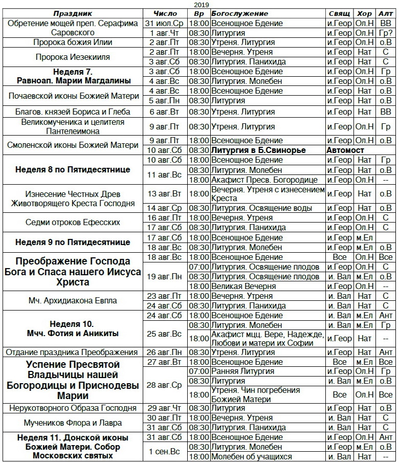 Расписание богослужений на август 2019 г.