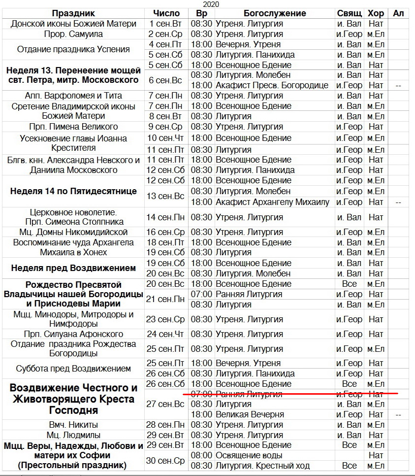 Расписание богослужений на сентябрь 2020 г.