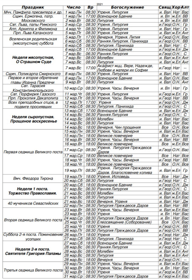 Расписание богослужений на март 2021 г.