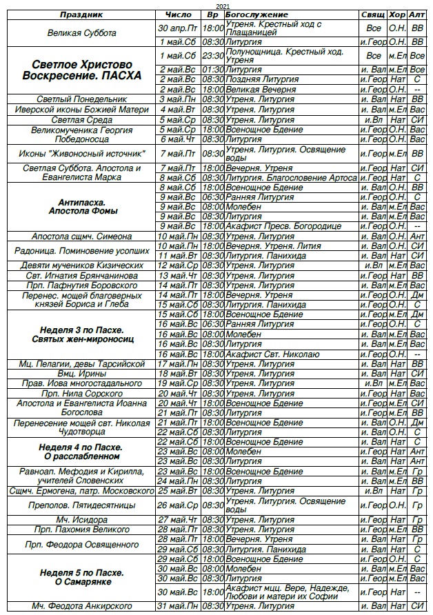Расписание богослужений на май 2021 г.