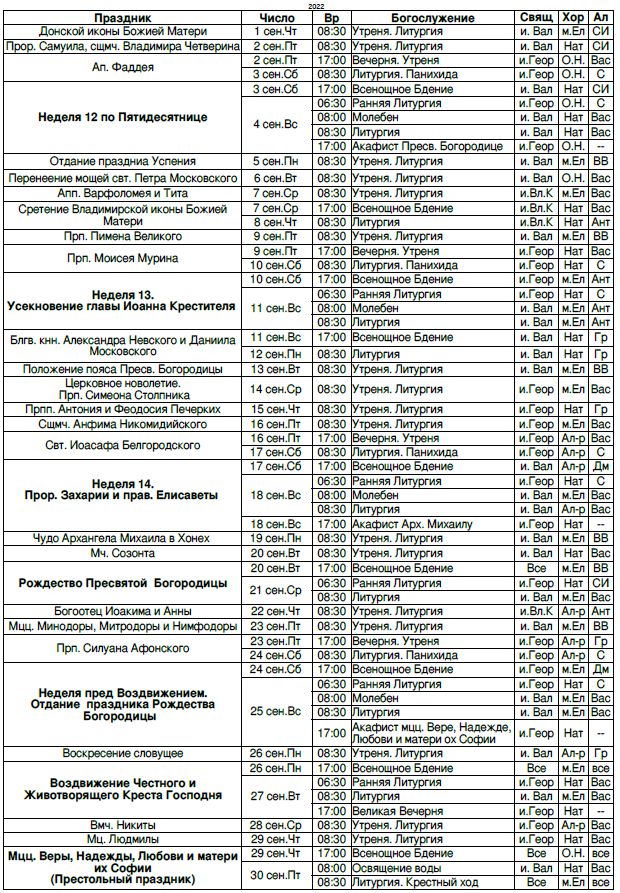 Расписание богослужений на сентябрь 2022 г.