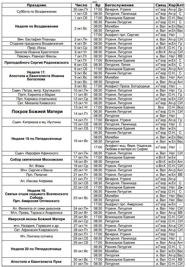 Расписание богослужений на октябрь 2022