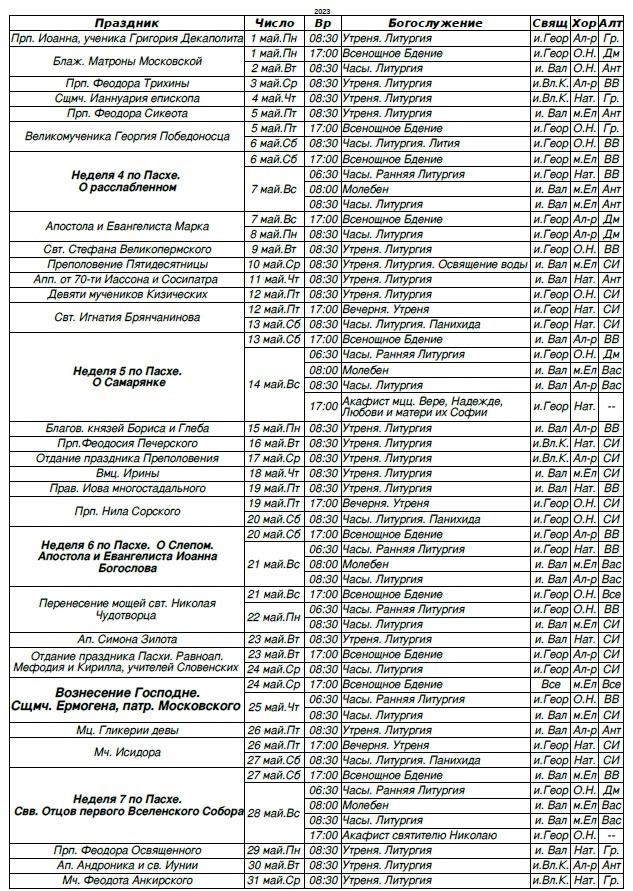 Расписание богослужений на май 2023 г.