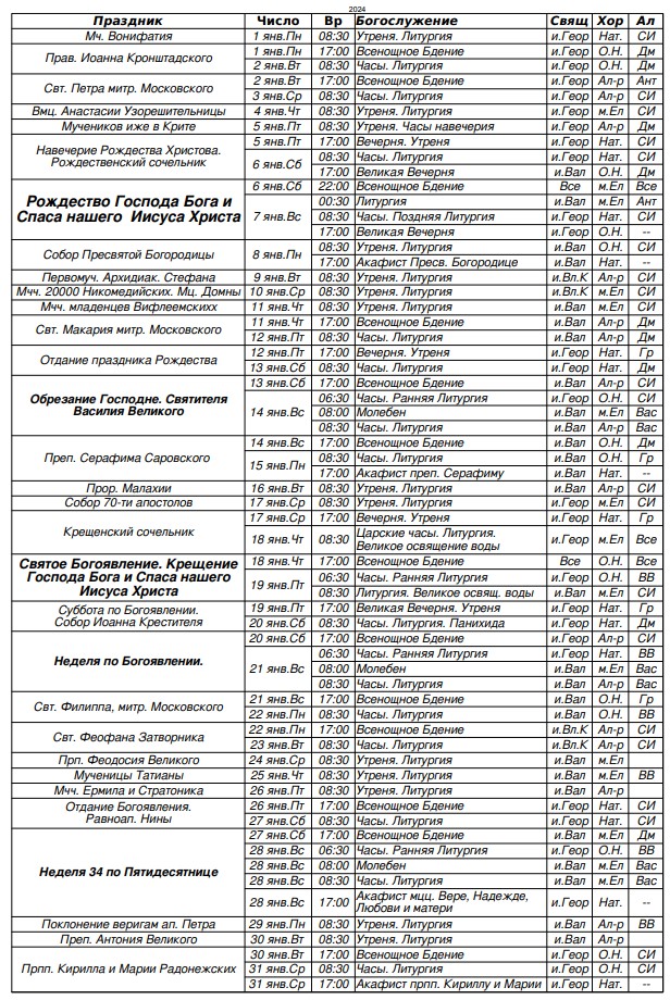 Расписание богослужений на январь 2024 г.