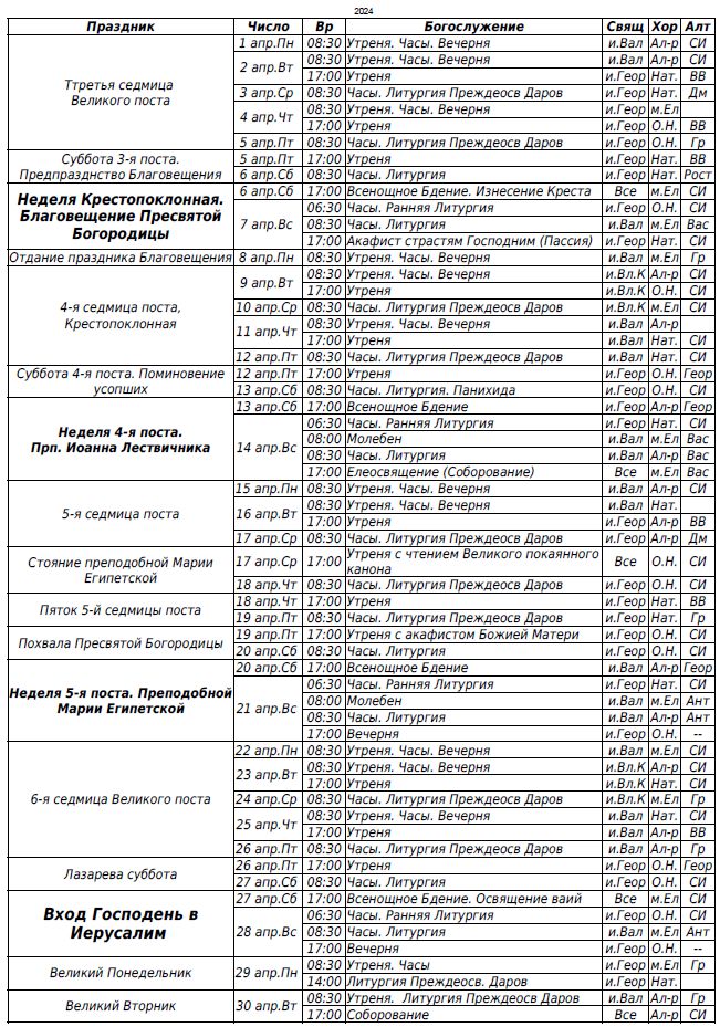 Расписание богослужений на апрель 2024 г.