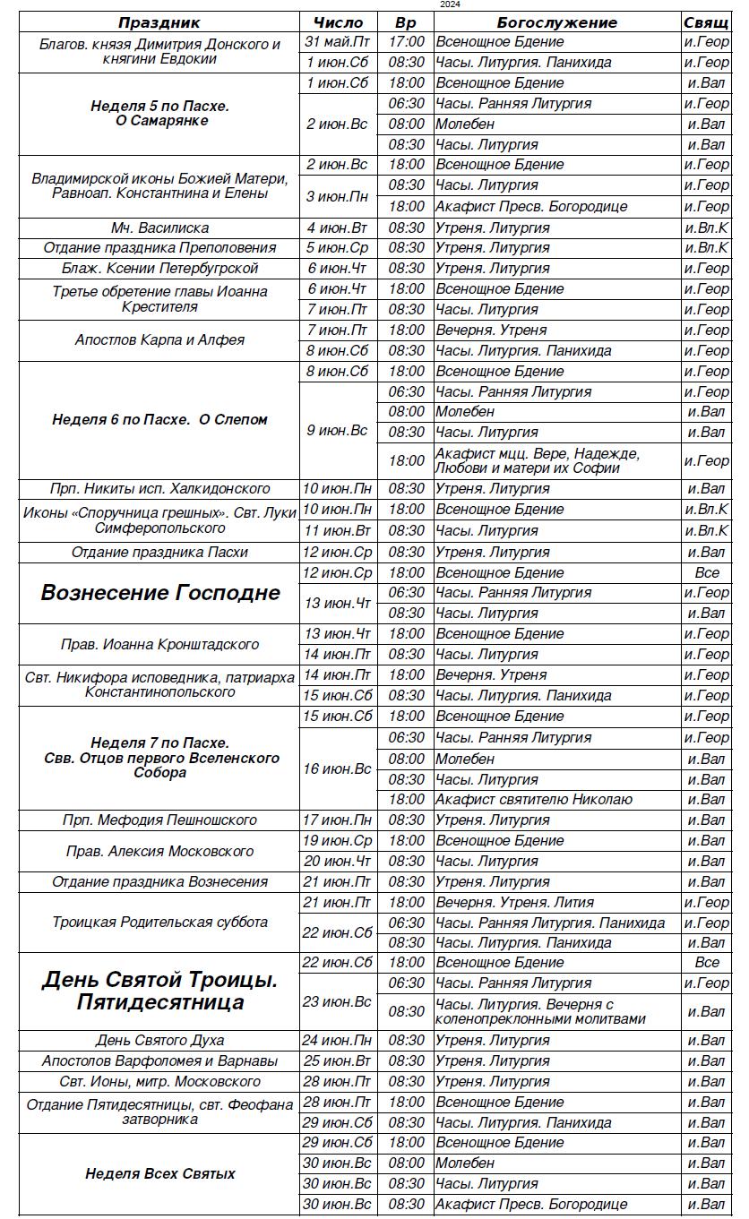 Расписание богослужений на июнь 2024 г.