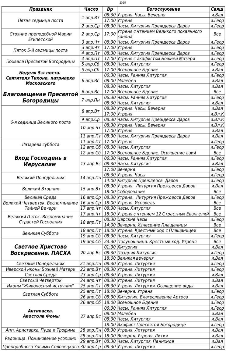 Расписание богослужений на апрель 2025 г.