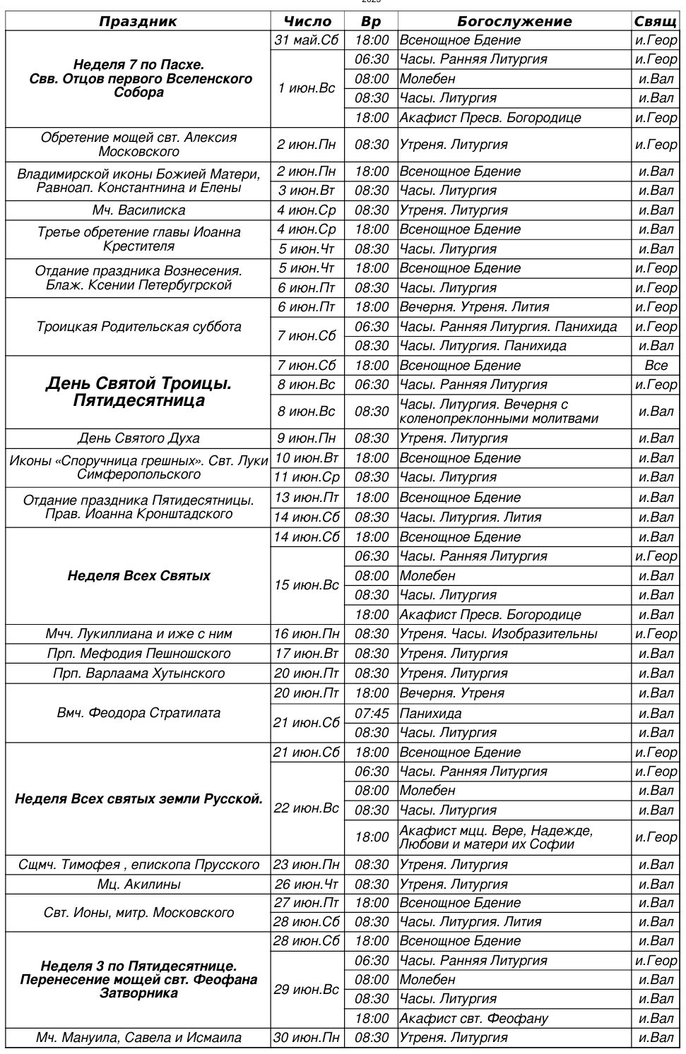 Расписание богослужений на июнь 2025 г.