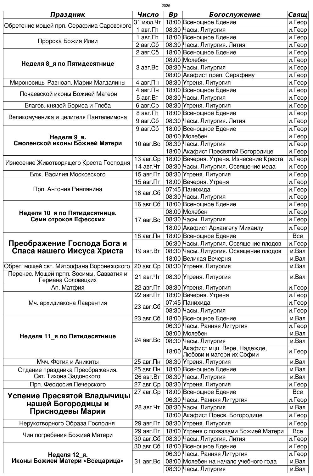 Расписание богослужений на август 2025 г.