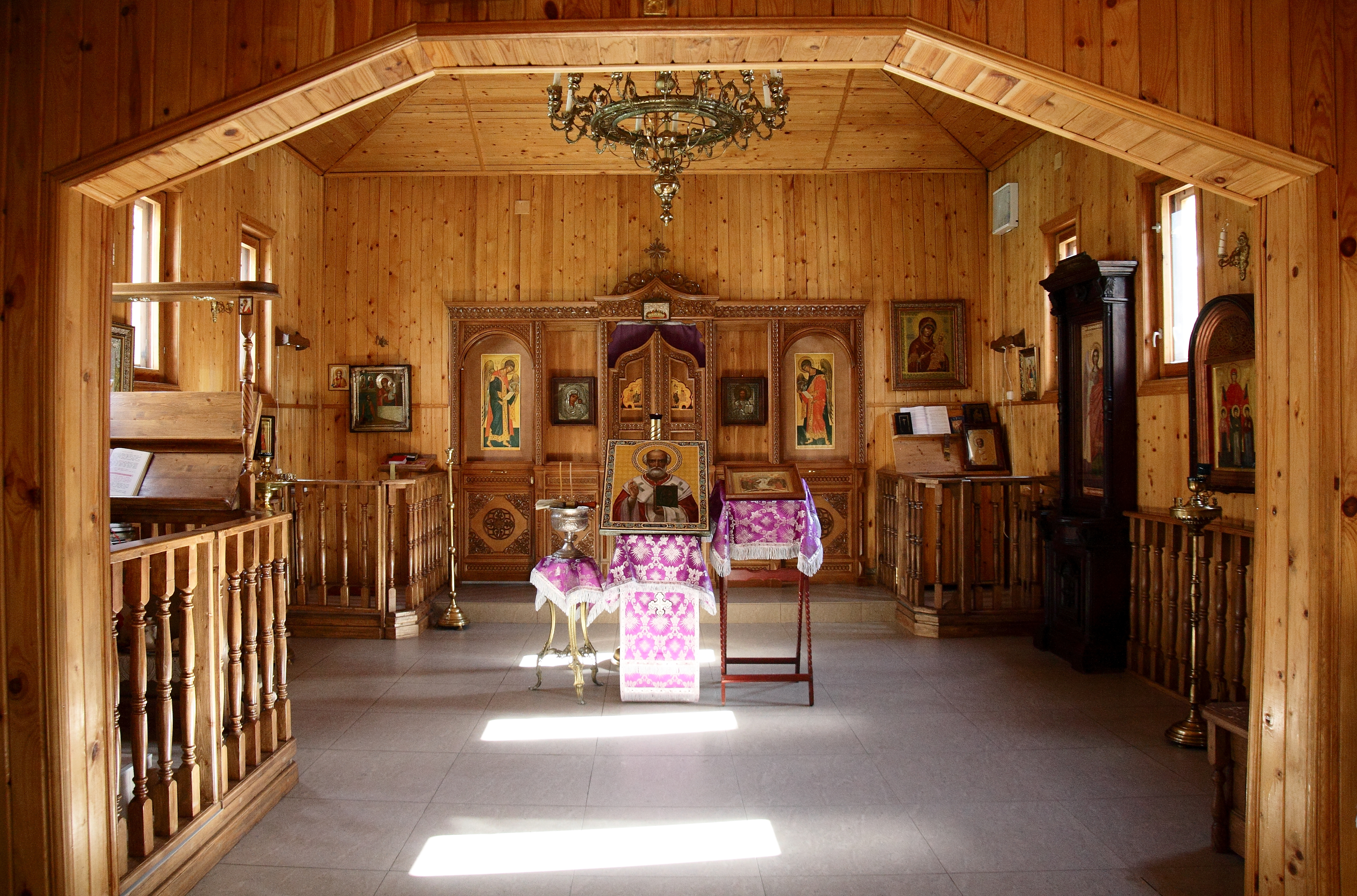 Внутри малого храма, после освящения отреставрированной иконы Николая Чудотворца