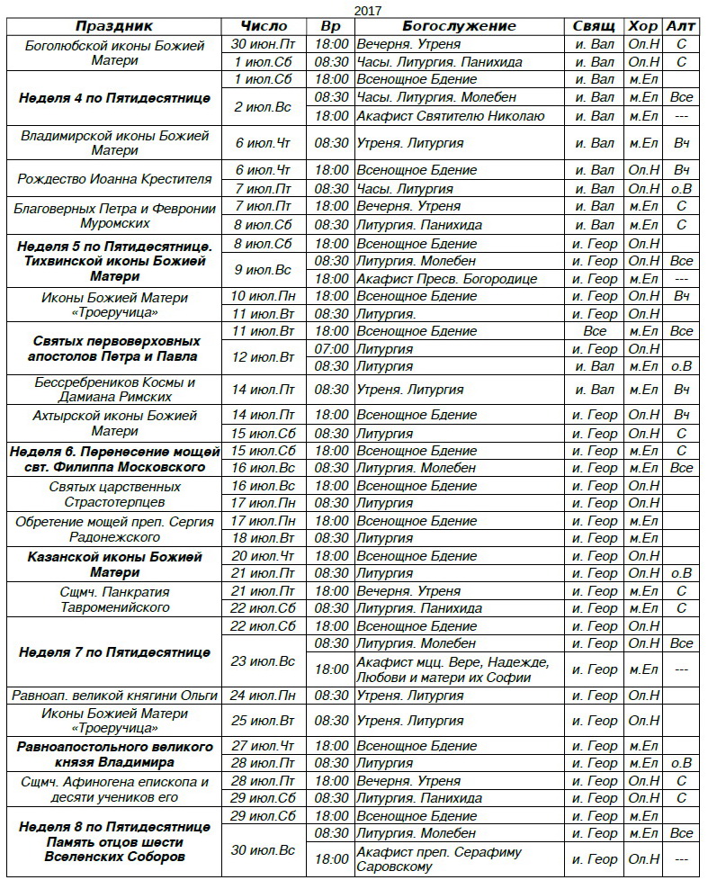 Расписание богослужений на июль 2017