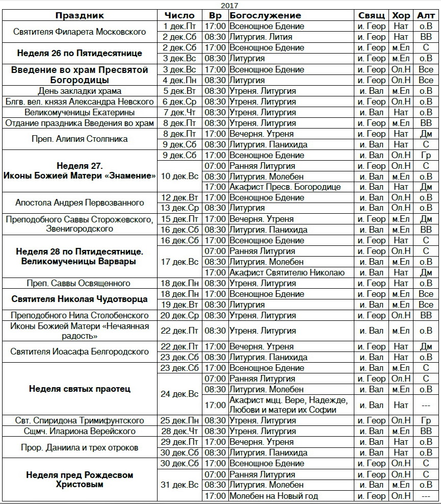 Расписание богослужений на декабрь 2017 г.
