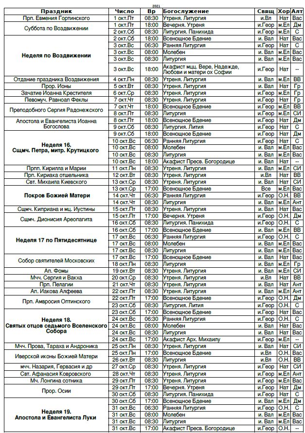 Расписание богослужений на октябрь 2021 г.