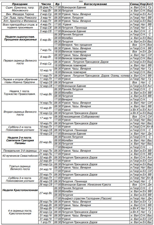 Расписание богослужений на март 2022 г.