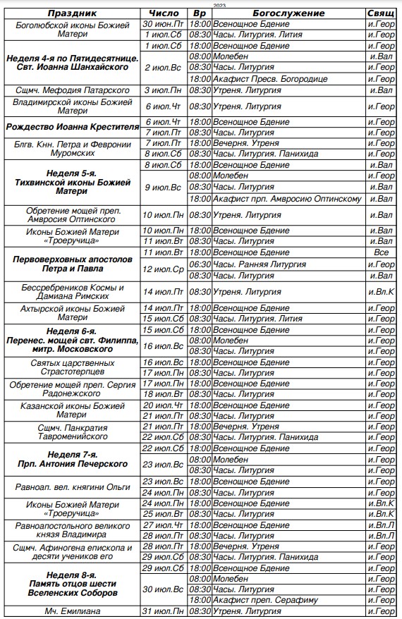 Расписание богослужений на июль 2023 г.
