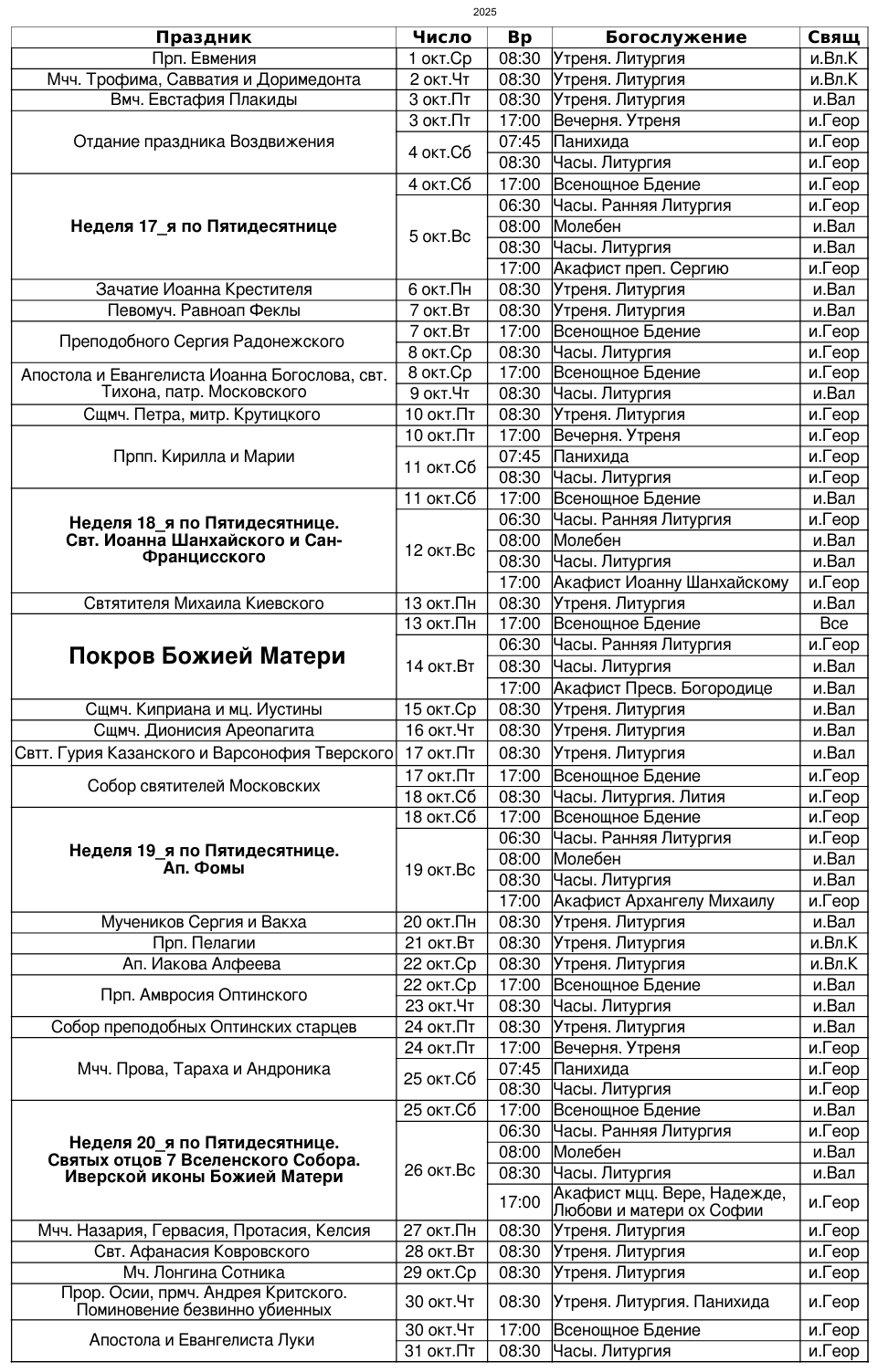 Расписание богослужений на октябрь 2025 г.